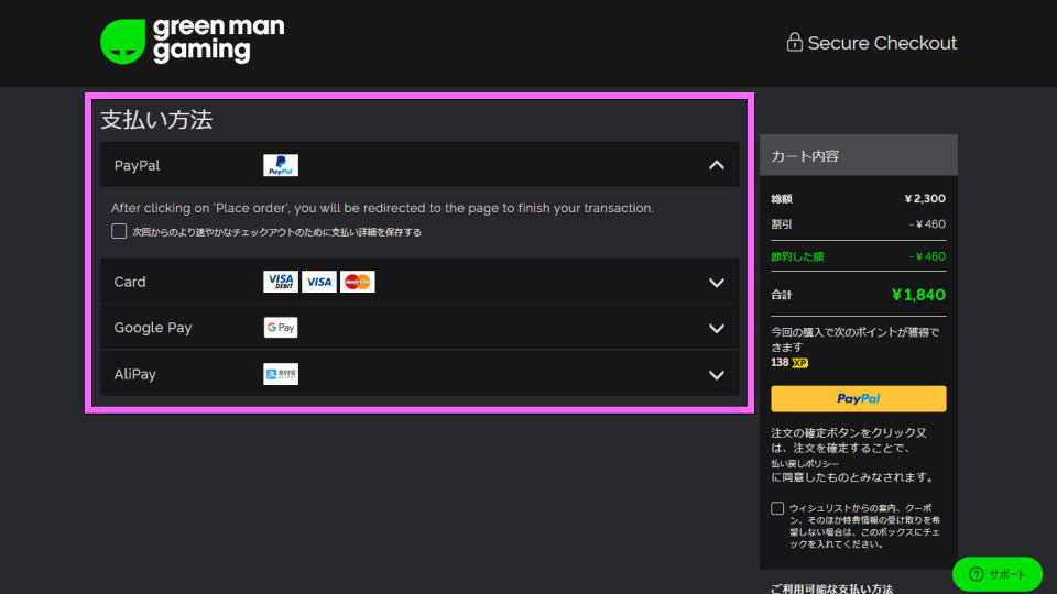 ショッピングカートに移動したら、必要に応じてクーポンコードを入力して「支払いに進行する」です。