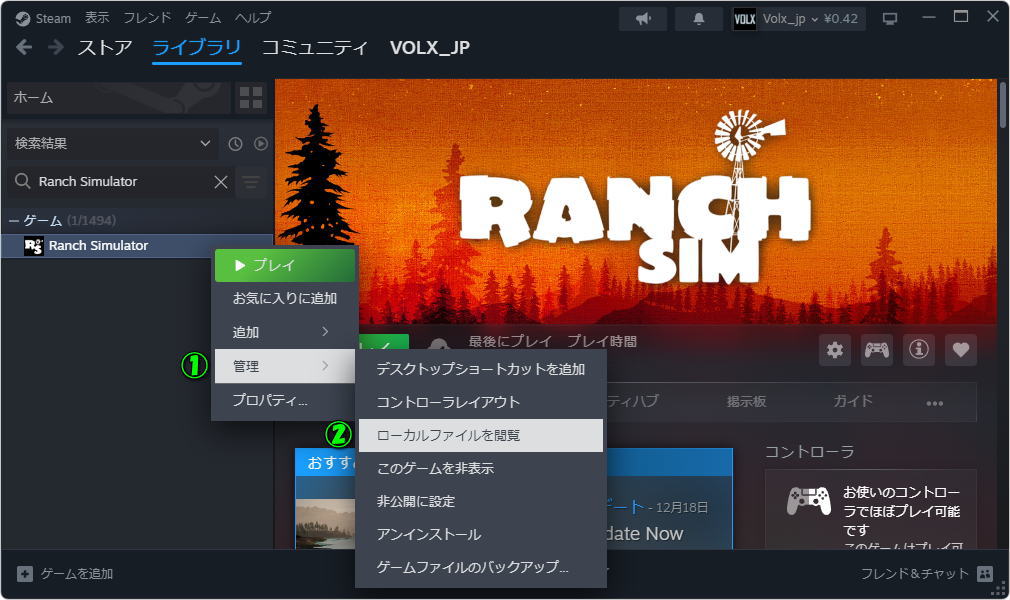 RanchSimulator_JP.zipをダウンロードしたら「Steam」を起動し、Ranch Simulatorを「右クリック」して「管理」を開き「ローカルファイルを閲覧」を選択します。