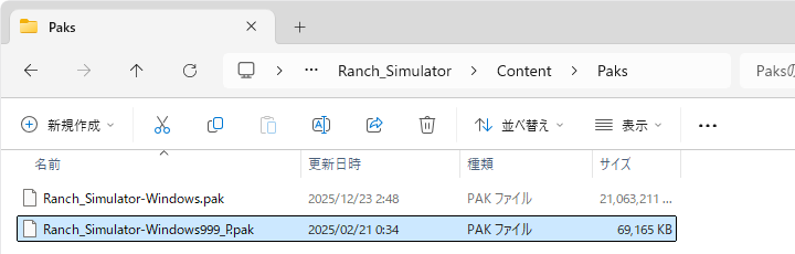 下記ディレクトリに、RanchSimulator_JP.zipの中身である「Ranch_Simulator-Windows999_P.pak」をコピーします。