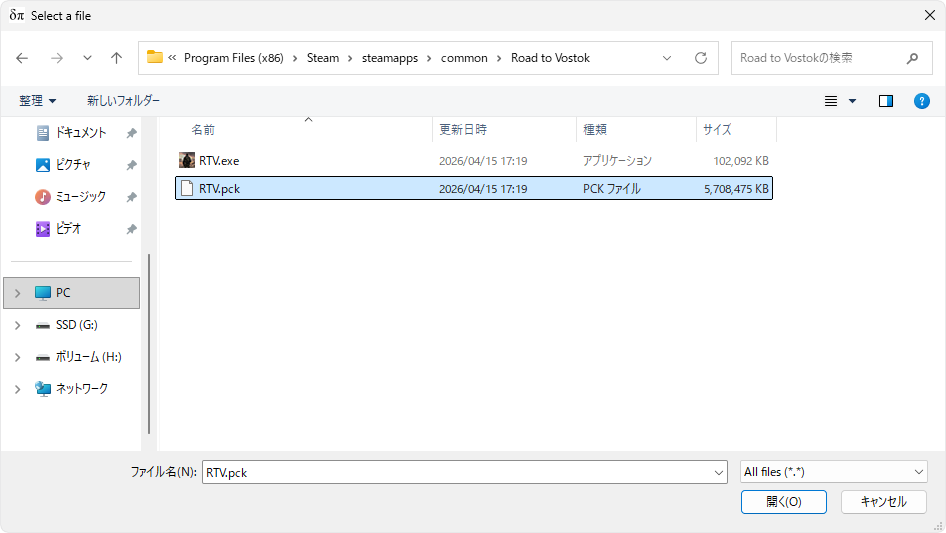 1️⃣Original file ⇒ Steamのインストールフォルダにある「RTV.pck」を指定します