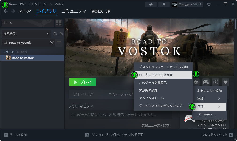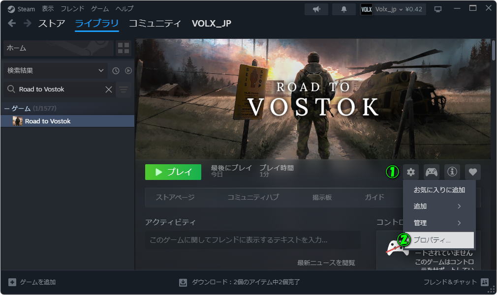 Road to Vostokの日本語化を戻したり、新しい日本語化ファイルを適用する場合は「Steam」を起動して「設定」の中にある「プロパティ」に進みます。