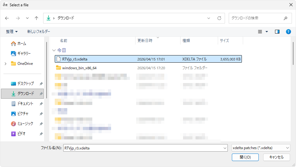 2️⃣XDelta patch ⇒ 先程ダウンロードした「RTVjp_r3.xdelta」を指定します