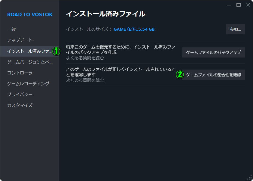 Road to Vostokのプロパティを開いたら「インストール済みファイル」から「ゲームファイルの整合性を確認」を実行します。