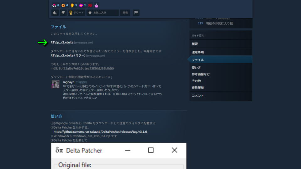 このときダウンロードできない場合は、前述したSteamコミュニティに戻り「RTVjp_r3.xdelta (ミラー)」のリンクを利用してください。