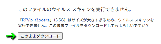 『このファイルのウイルス スキャンを実行できません。「RTVjp_r3.xdelta」(3.5G)はサイズが大きすぎるため、ウイルス スキャンを実行できません。このままファイルをダウンロードしてもよろしいですか?』と表示されたら「このままダウンロード」します。
