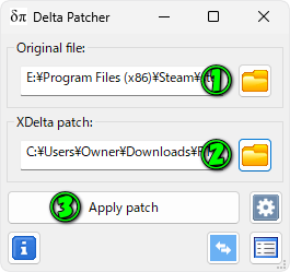 DeltaPatcher.exeを実行したら、下記の指示に従ってパッチを適用します。