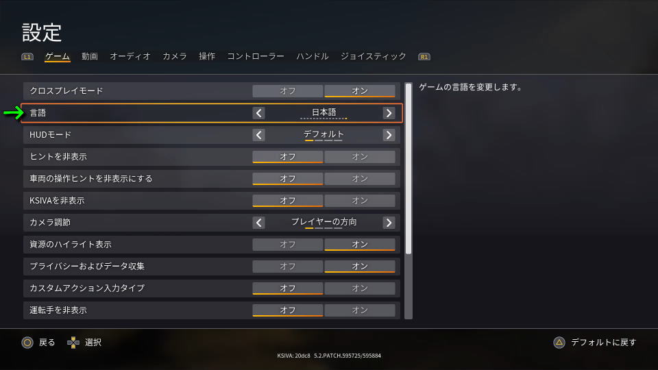 SETTINGSに移動したら「GAMEタブ」から、任意の「Language」を選択します。