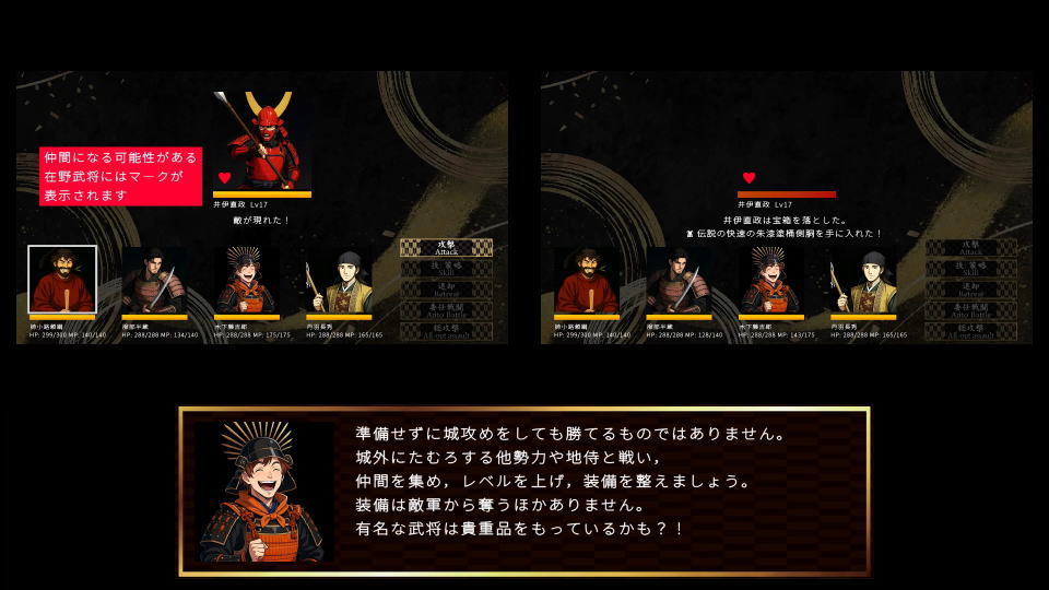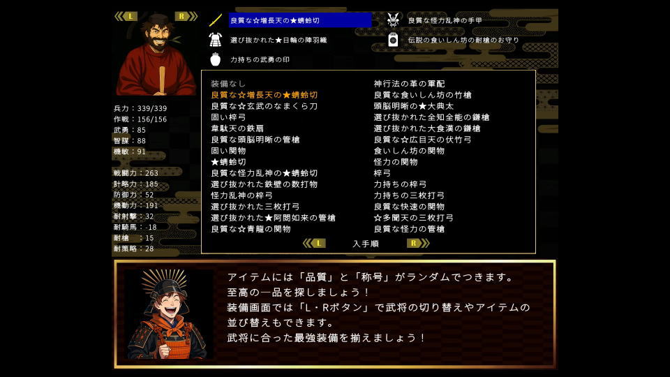 装備は敵軍から奪うことができ、有名な武将は貴重な品を持っている可能性があります。