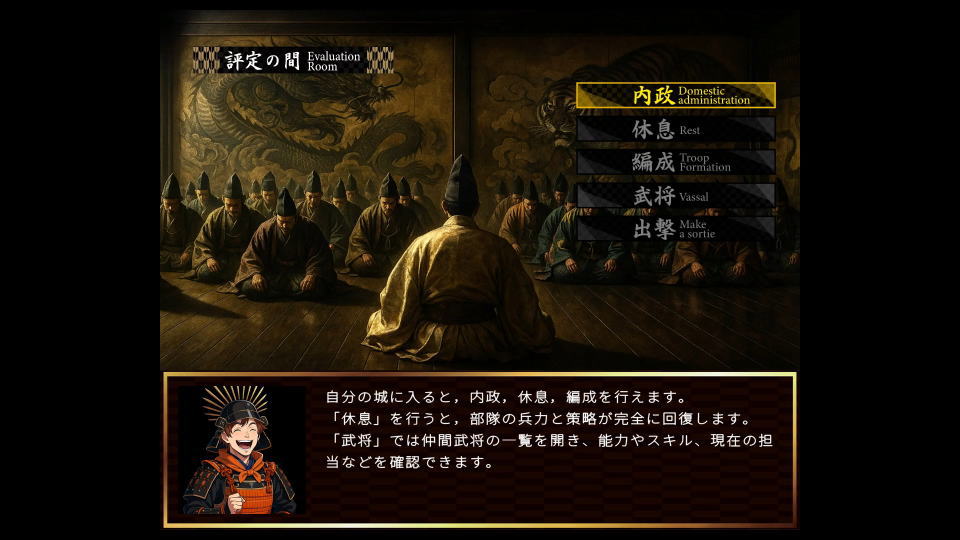自分の城に入ると「内政 / 休息 / 編成」が行えます。