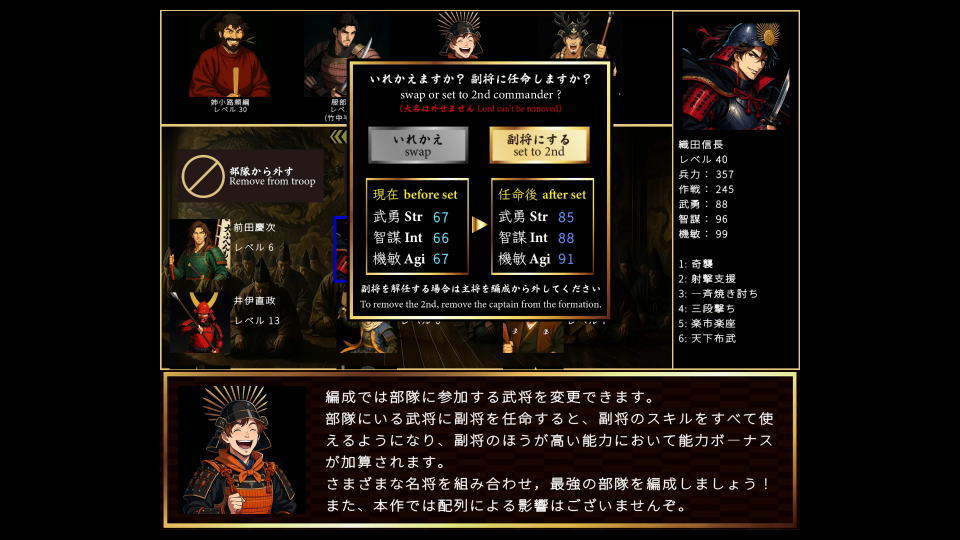 編成では部隊に参加する武将を変更でき、副将を任命すると副将のスキルがすべて使えるようになるほか、能力にボーナスが加算されます。