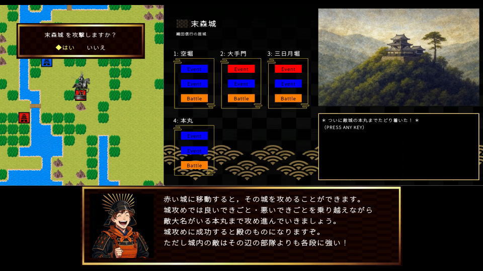 赤い城「他勢力の城」に移動したら、様々なイベントを乗り越えつつ本丸を目指して攻めていきましょう。