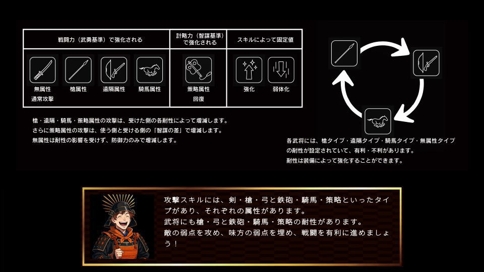 攻撃スキルには「剣・槍・弓・鉄砲・騎馬・策略」などの種類があり、それぞれの属性があります。