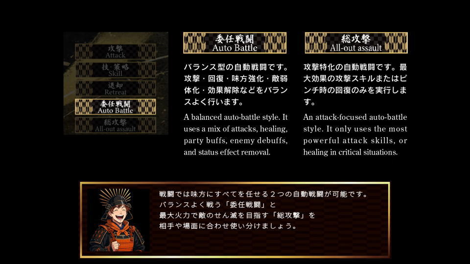 バランスよく戦う「委任戦闘」と最大火力で敵の殲滅を目指す「総攻撃」を、相手や場面で使い分けます。