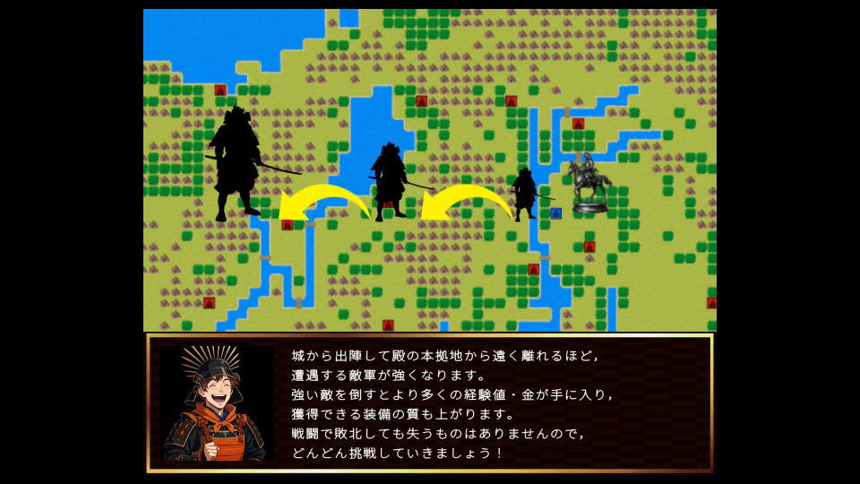 遭遇する敵は「本拠地からの距離」に比例して強くなり、経験値・金・装備の質が上昇していきます。