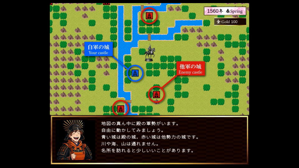 青い城は自軍の城、赤い城は他勢力の城で、川・海・山は通過できず、名所には良いことが期待できます。