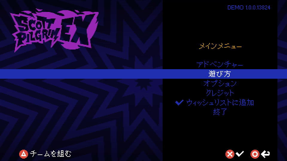 Scott Pilgrim EXの操作を確認するには、タイトルメニューから「遊び方」に進みます。