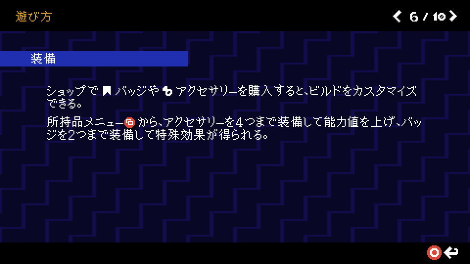 ・所持品メニューから、アクセサリーを4つまで装備して能力値を上げ、バッジを2つまで装備して特殊効果が得られる