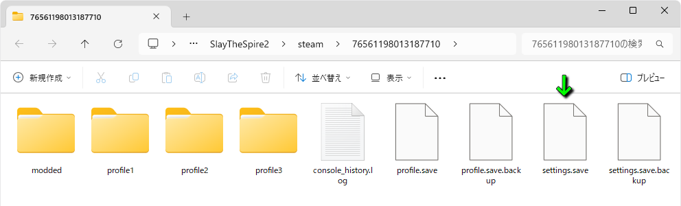 MODを利用せずコンソールを利用するには、Slay the Spire 2に関連する「settings.save」を編集します。
