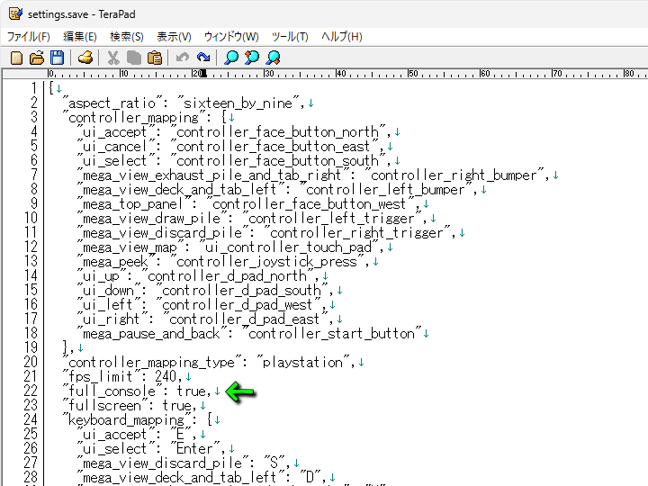 このsettings.saveの任意の位置に「"full_console": true,」を入力して保存します。