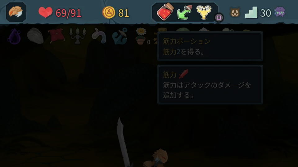 左からキャラクター、ライフ、ゴールド、ポーション、部屋の種類、階数、ボスの名前です。