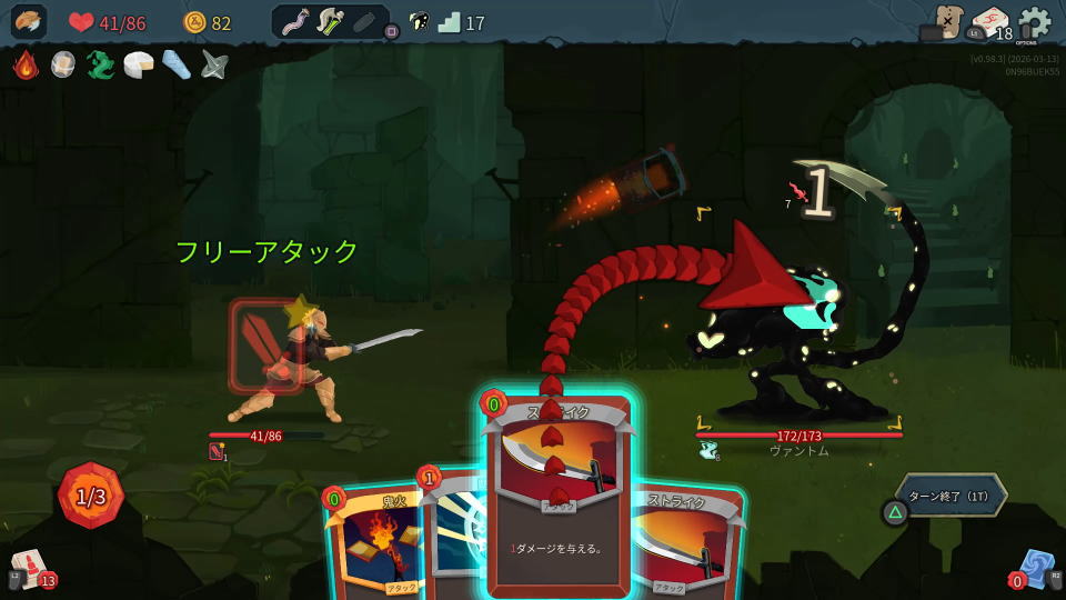 | 9ターン | 11ダメージ:11ダメージのアタックを1回行う |