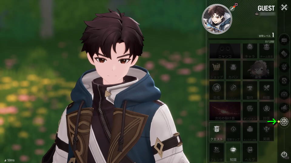 モンギル:STAR DIVEの操作を確認するには、キャラクターが操作できるようになってから右上の「メニュー」を開きます。