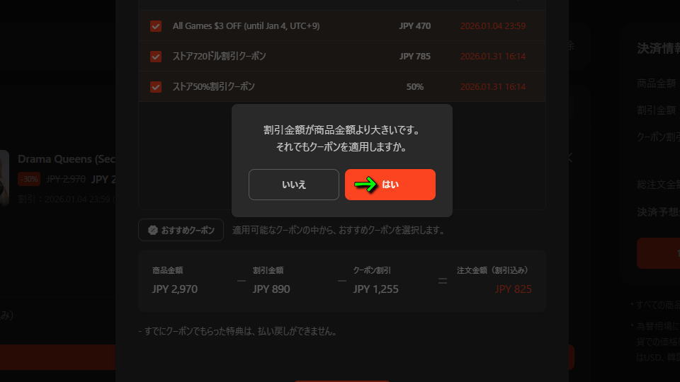 3つのクーポンを使用すると『割引金額が商品金額より大きいです。それでもクーポンを適用しますか』というメッセージが出ます。