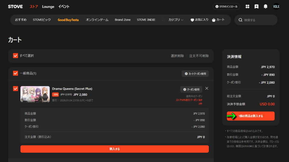 Drama Queens (Secret Plus)をカートに入れたら、先程と同じように「クーポン使用」を選択します。