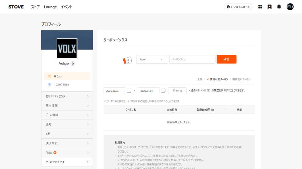 STOVEで現在使用可能なクーポンを確認するには、プロフィールの「クーポンボックス」にアクセスします。