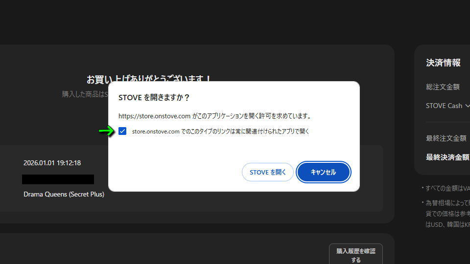 『https://store.onstove.com/がこのアプリケーションを開く許可を求めています』と表示されたら、任意で図示した項目にチェックを入れ「STOVEを開く」を選択します。