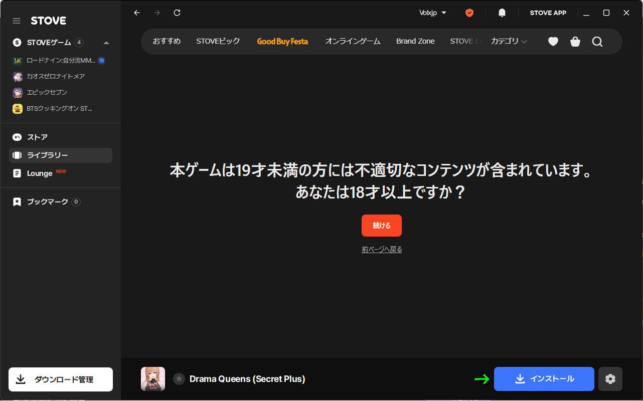 Drama Queens (Secret Plus)のインストールが終わったら「ゲーム開始」を選択します。