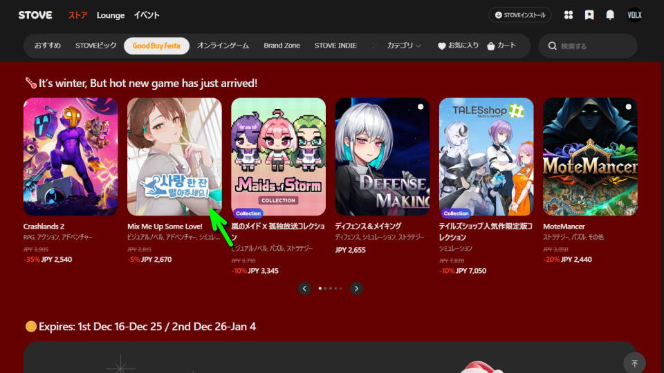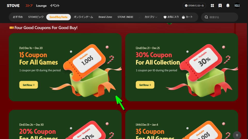 現在年末年始のキャンペーンとして割引クーポンが配られている、ゲームショップのひとつであるSTOVE。