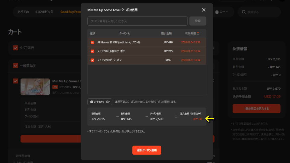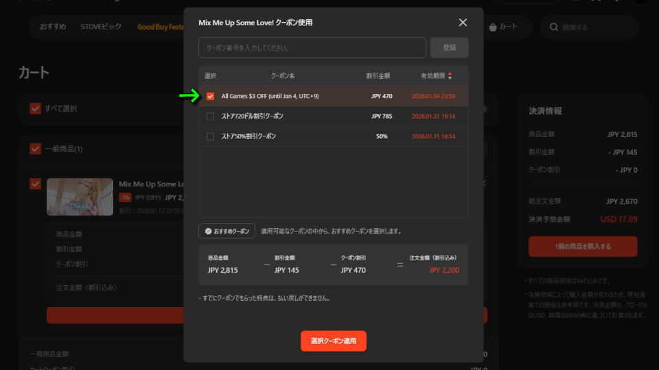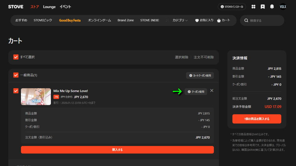 Mix Me Up Some Love!をカートに入れたら、画面中央にある「クーポン使用」を選択します。
