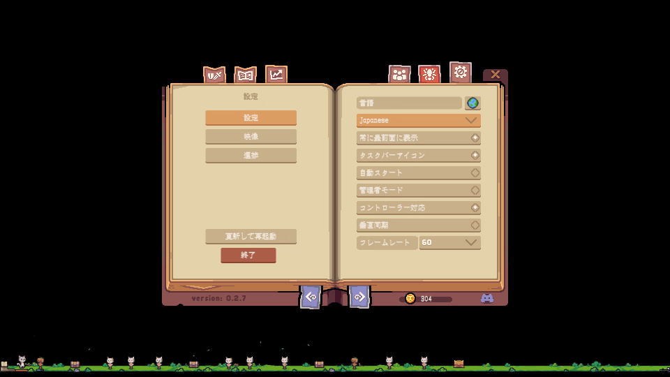 6番目の「設定」では前述した日本語化や、各種設定が行えます。