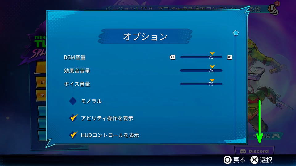 ミュータント タートルズの操作を確認するには、タイトルメニューから「オプション」に進みます。