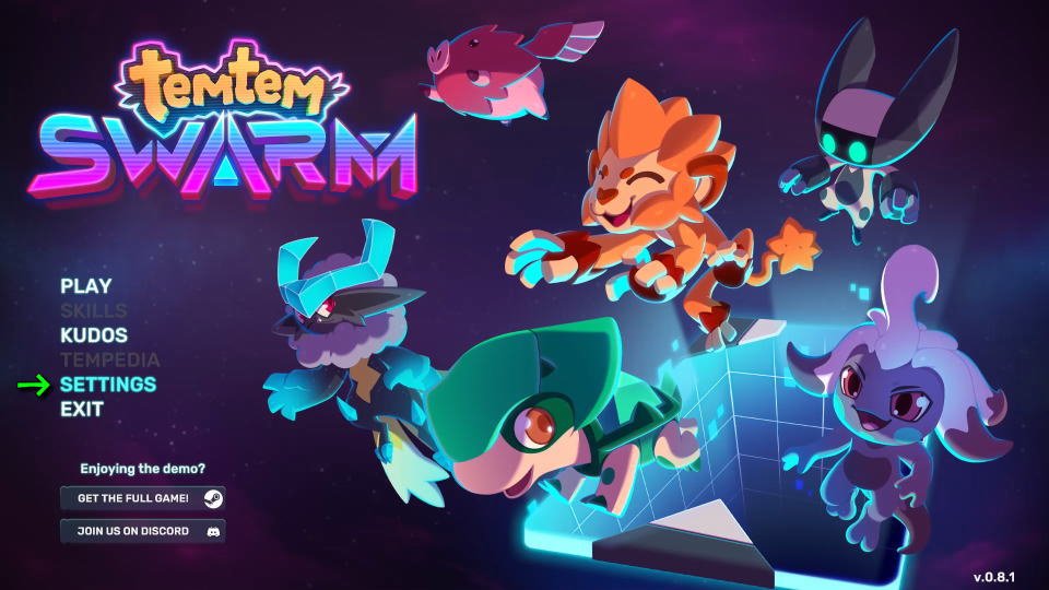 Temtem Swarmを日本語化するには、タイトルメニューから「SETTINGS」に進みます。