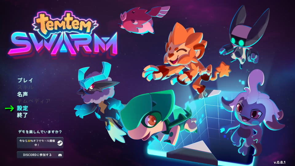 Temtem Swarmの操作を確認するには、日本語化済みのタイトルメニューから「設定」に進みます。