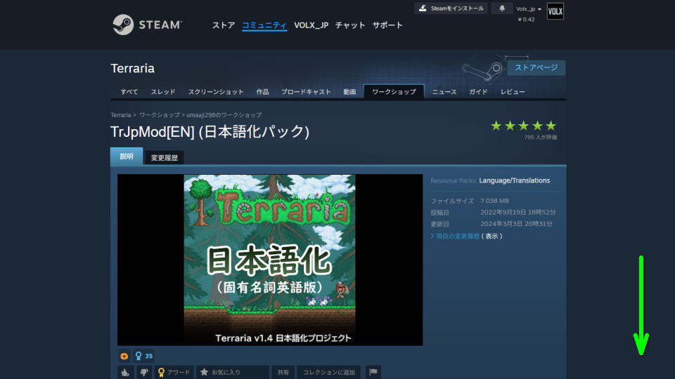 例として「TrJpMod[EN] (日本語化パック)」のページに移動したら、画面を下にスクロールします。
