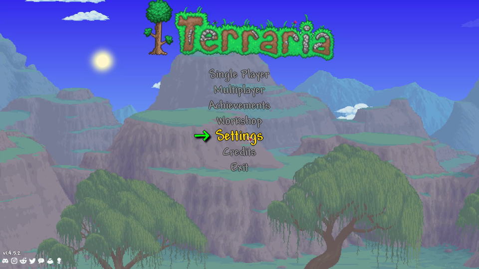 Terrariaを日本語化するには、タイトルメニューで「Settings」を選択します。
