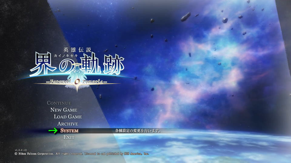 英雄伝説 界の軌跡の操作を確認するには、タイトルメニューから「SYSTEM」に進みます。