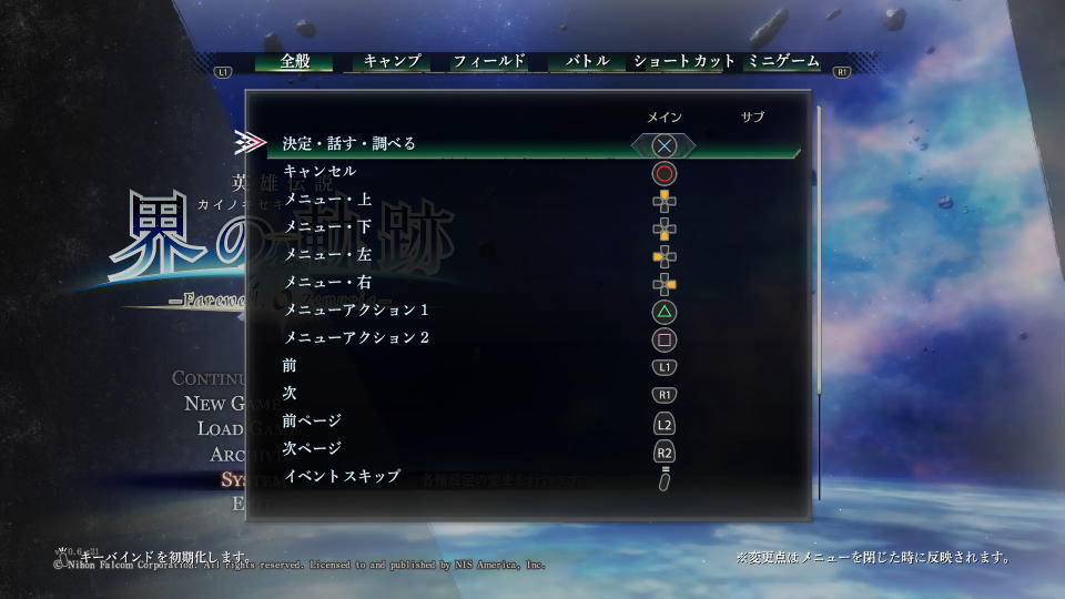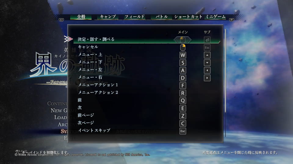 英雄伝説 界の軌跡の「キーボード設定」です。