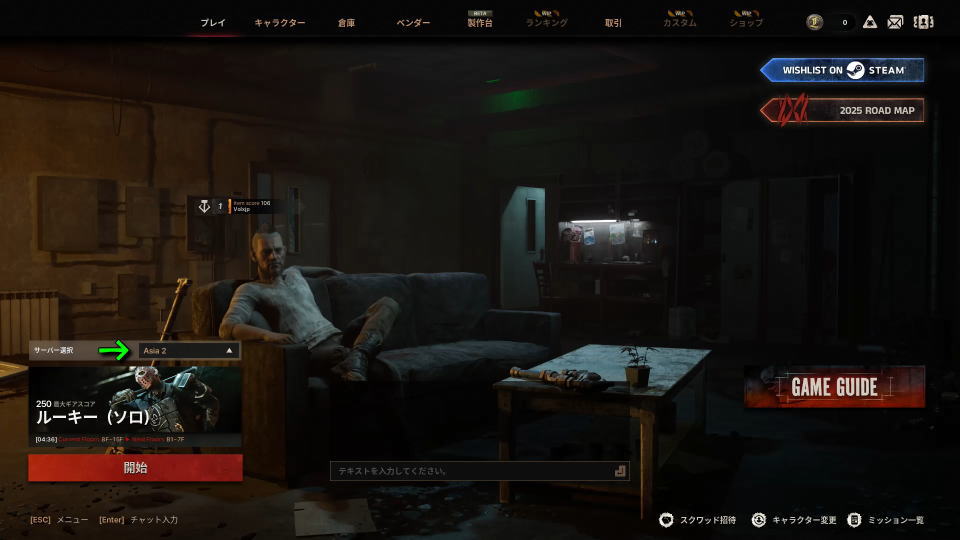 The Midnight Walkersのサーバを選択するには、キャラクターを作成した後に表示されるロビー左側にある「サーバー選択」をクリックします。