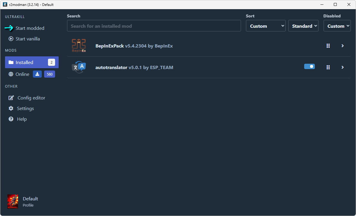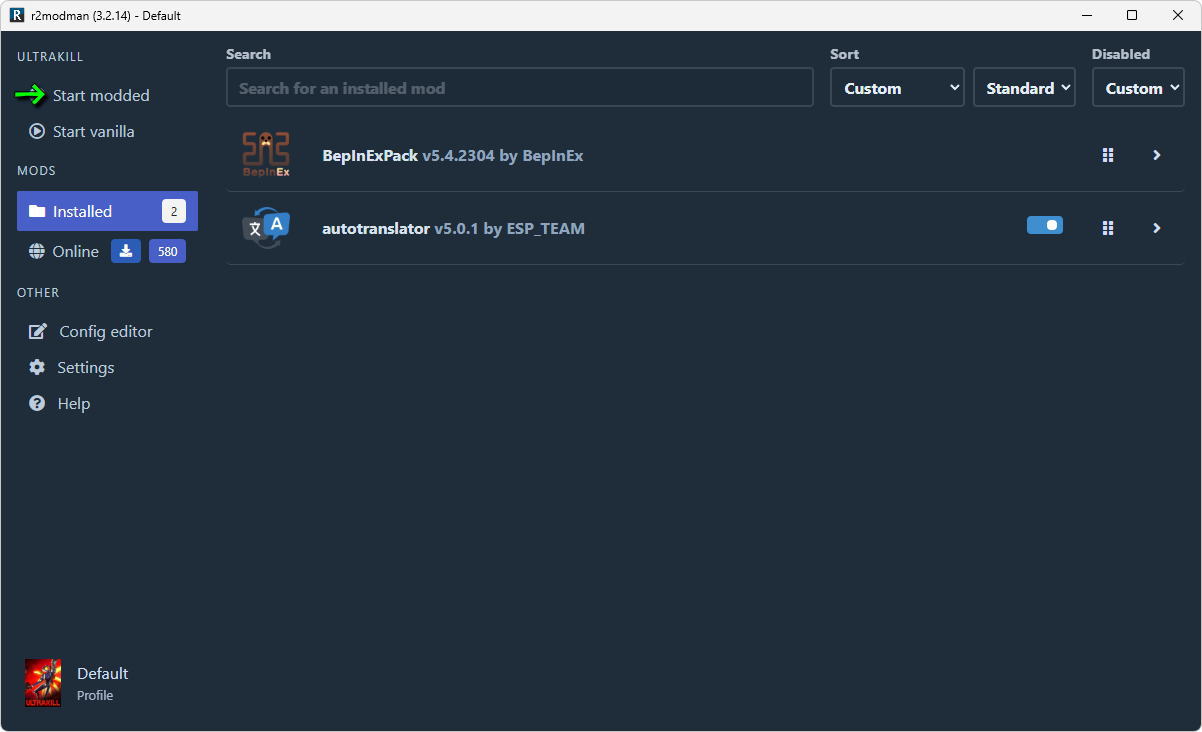 AutoTranslatorConfig.iniをコピーしたら、r2modmanの「Start modded」からULTRAKILLを起動します。