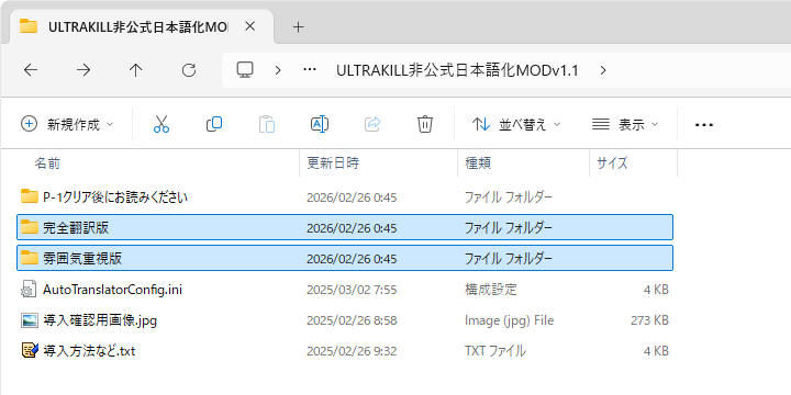 ULTRAKILLが終了したことを確認して、フォルダ「ULTRAKILL非公式日本語化MODv1.1」を開きます。