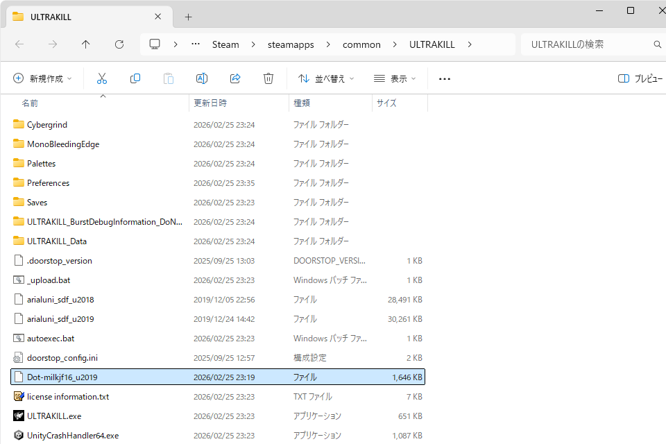 ダウンロードした「Dot-milkjf16_u2019」を、ULTRAKILLのインストール先にコピーします。