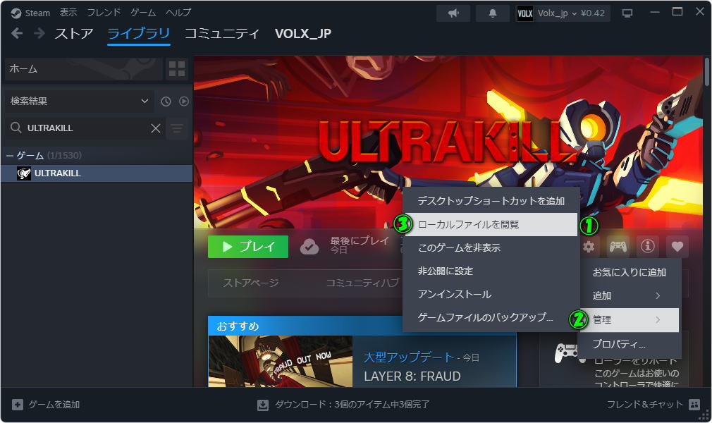 Steamを起動し「設定」の「管理」から「ローカルファイルを閲覧」を選択します。