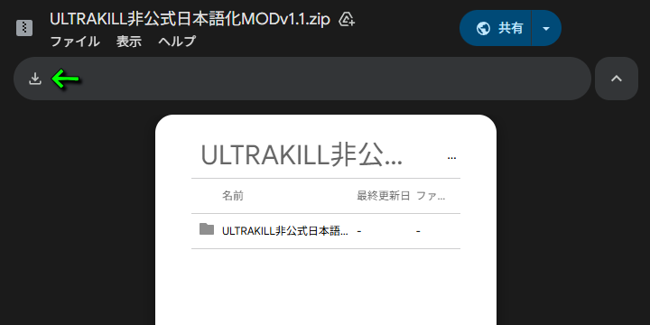 Googleドライブに移動したら「ULTRAKILL非公式日本語化MODv1.1.zip」をダウンロードします。