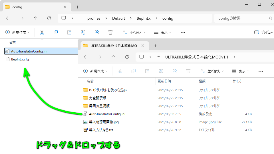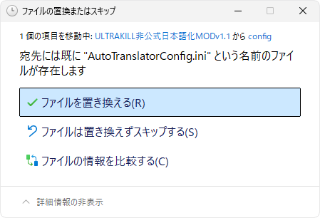 コピーする際『宛先には既に"AutoTranslatorConfig.ini"という名前のファイルが存在します』と表示されたら「ファイルを置き換える」で確定します。