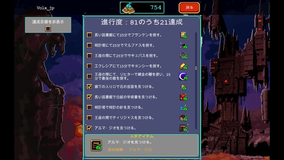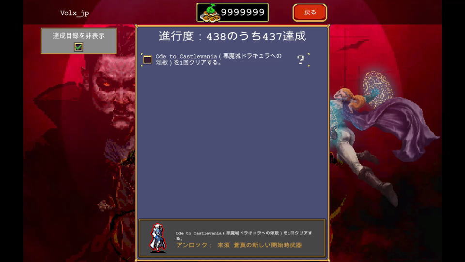 検証の結果、クリア条件は「悪魔城ドラキュラへの頌歌のアドベンチャーモード」なのではと推測しました。