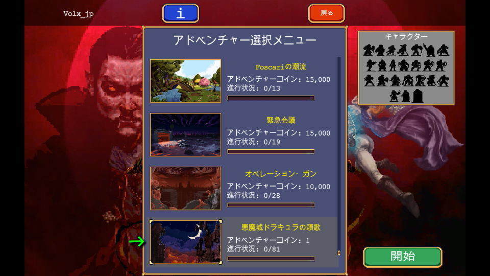 移動先の『アドベンチャー選択メニュー』から、目的の「悪魔城ドラキュラへの頌歌」で確定します。